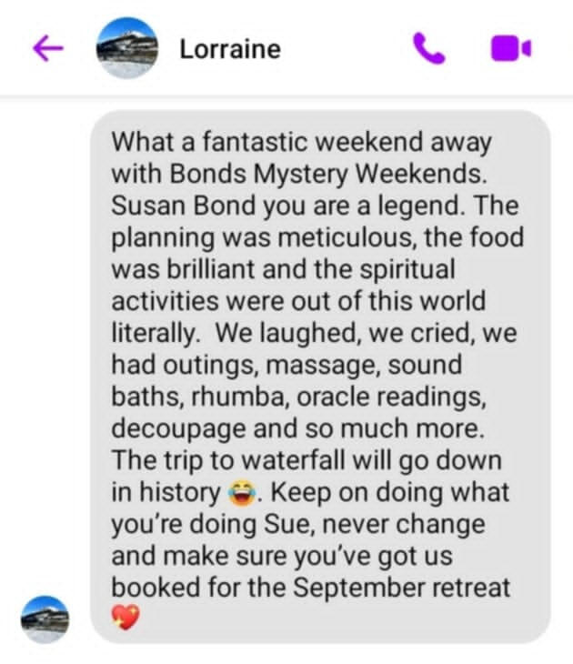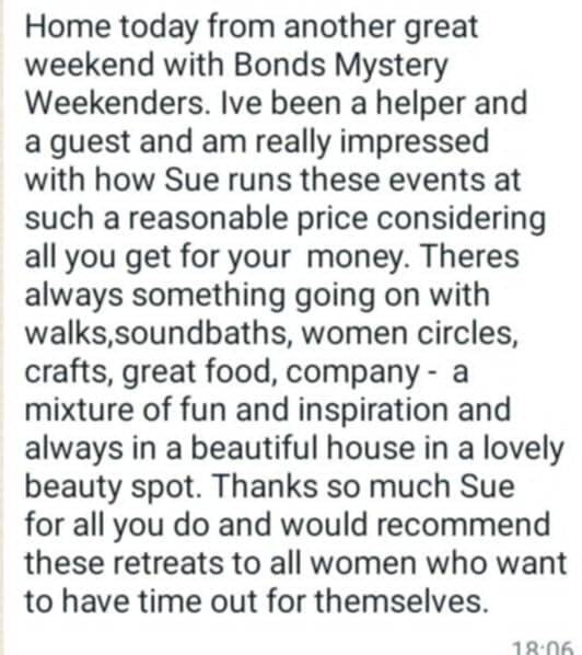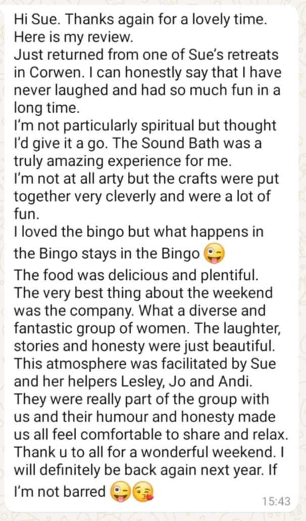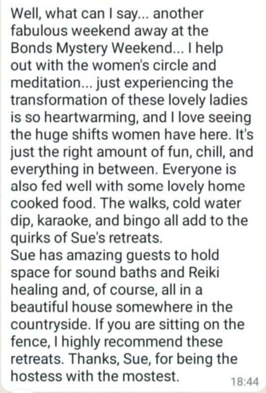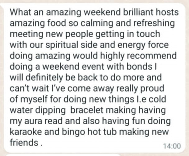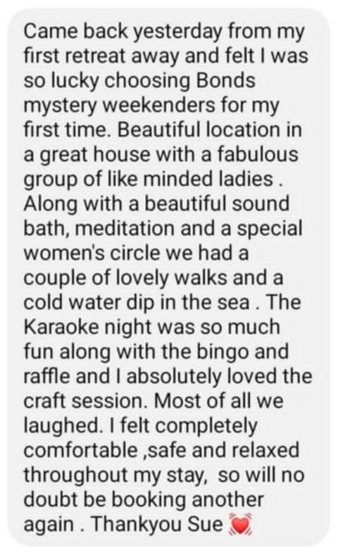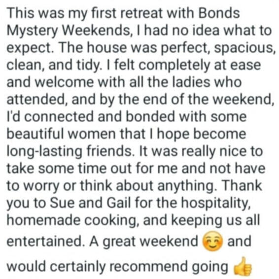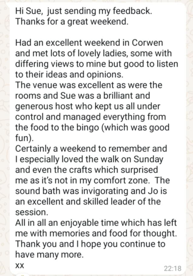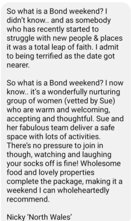 Originally from Manchester but decided in 2021 to move to North Wales to escape city life.My career had always been office based as a legal secretary but in 2021 I embarked on my Spiritual Awakening journey and made the decision to turn my back on the corporate world and venture into nature.I didn't know anybody in North Wales but quickly began to make friends with other ladies who helped me learn new activities and opened up my creative side.My caravan was only small but to make ends meet I opened my small home to ladies who were also embarking on their own spiritual journeys. On a 1-2-1 basis I would provide home cooked food, teach them new skills and gain confidence to make changes to their own lives.My new journey was getting more and more exciting. I was manifesting and creating a fabulous life for myself. Not rich in money but rich in life and freedom. By changing my way of living, I began to realise that we don't need lots of money and materialistic lifestyles to be happy.My manifesting was getting better and bigger and I eventually was able to upgrade my caravan and Pandora cat came into my life.At that point, I realised that what I was providing for ladies was so important that I decided to create Bonds Adventure Weekenders (was Bonds Mystery Weekenders) and bring groups of ladies together, to gain new skills, experience new activities and make new friends.From soundbaths, cold water dips and dance exercise, to nature walks, craft sessions and karaoke - there is something for everyone to enjoy and experience.Either bring a family member or friend.....or just venture out on your own. There is an exciting Weekender awaiting you.The only problem we have is.....nobody wants to leave 😉I genuinely look forward to the future and thank all the amazing ladies who I have met already....and all the amazing ladies I am going to meet in the future. 🙏🙏🙏🙏